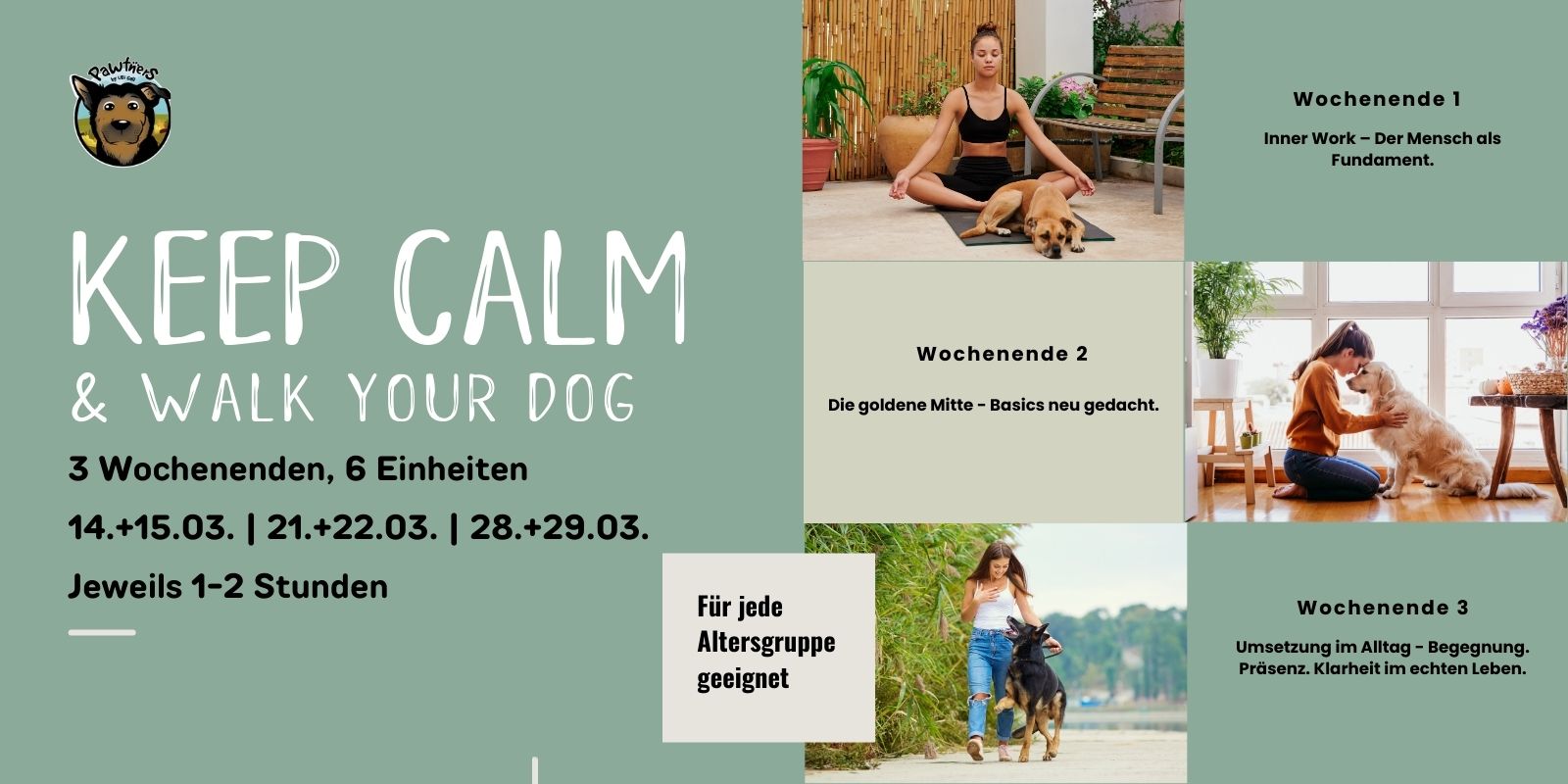 Keep Calm & Walk Your Dog 3 Wochenenden, 6 Einheiten14.+15.03. | 21.+22.03. | 28.+29.03.Jeweils 1-2 Stunden Für jede Altersgruppe geeignet Wochenende 1Inner Work – Der Mensch als Fundament. Wochenende 2Die goldene Mitte - Basics neu gedacht. Wochenende 3Umsetzung im Alltag - Begegnung. Präsenz. Klarheit im echten Leben.